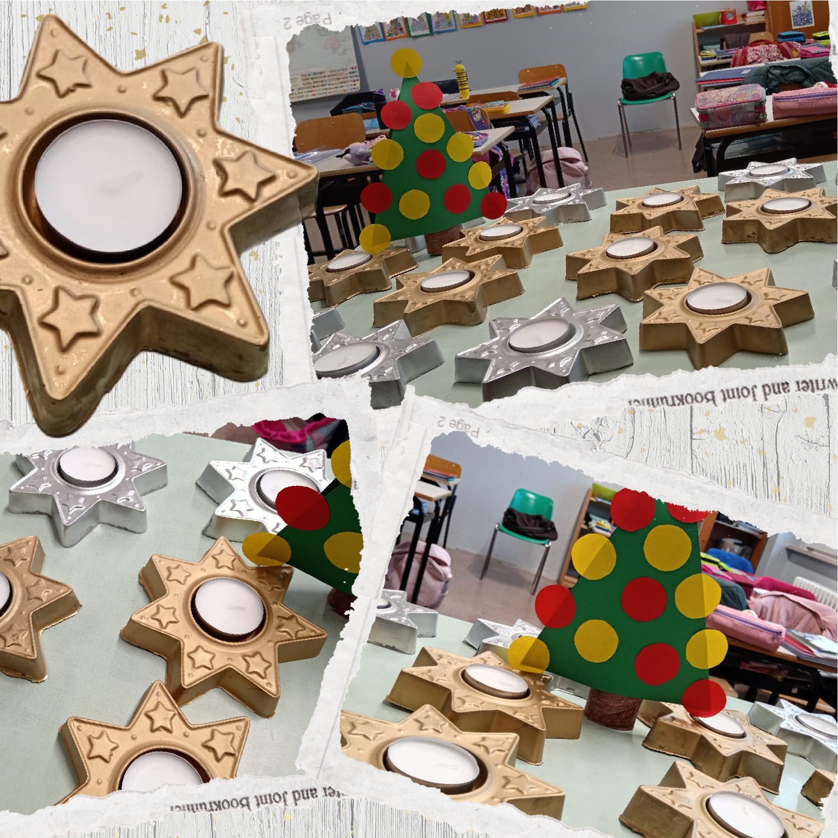 Per Natale gli alunni di 4A della scuola Bertinetti hanno realizzato "un lavoretto luminoso" : dei portacandele di scagliola colorati in oro o in argento che rallegreranno le Feste.